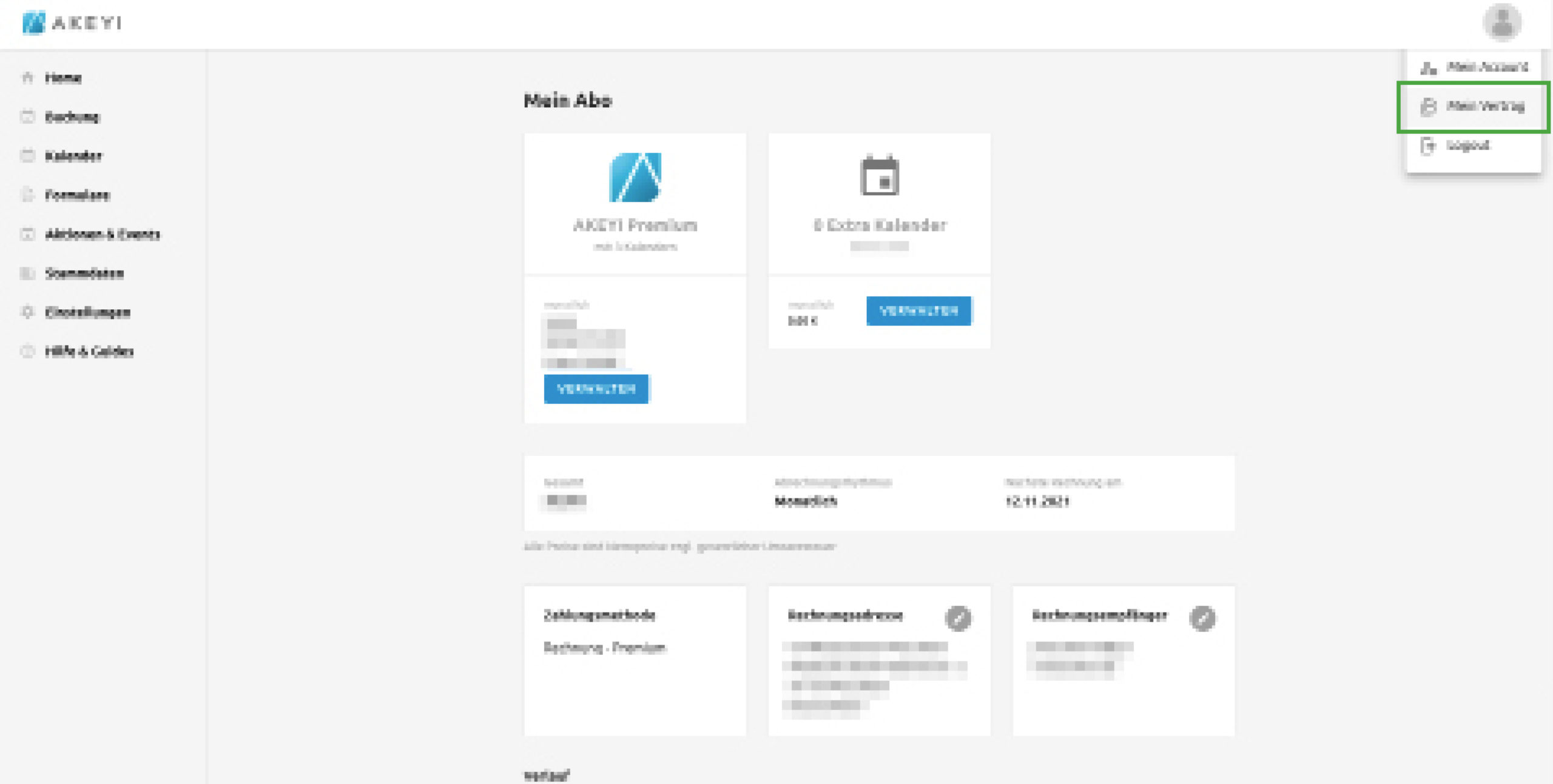Wenn du oben rechts auf dein Profilbild klickst, kannst du den Menüpunkt „Mein Vertrag“ auswählen.