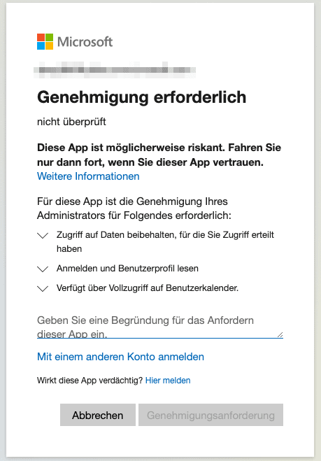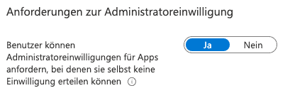 Dann sieht dein Systemadministrator im Azure-Portal unter „Azure Active Directory“ → „Unternehmensanwendungen“ → „Anforderungen zur Administratoreinwilligung“ deine Anfrage. Diese sollte er anklicken, dann „Berechtigungen und Einwilligung überprüfen“ wählen und dort „Akzeptieren“ klicken.