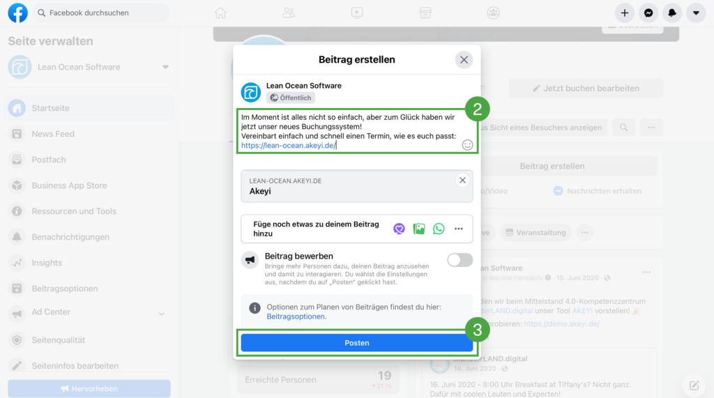 Dieser Guide zeigt dir, wie du deine AKEYI-Terminbuchung als “Call-to-Action” in Facebook-Posts nutzt, um mehr Kunden gewinnen.