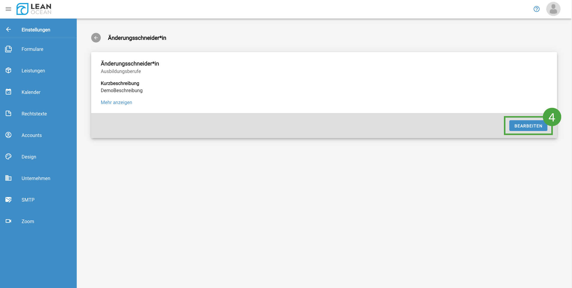 - Damit du eine Leistung später zu einer Aktion hinzufügen kannst, stelle die Eigenschaft “Leistungsliste” von “Individuell” bitte auf “Ausbildungsberufe” oder “Duales Studium” ein.