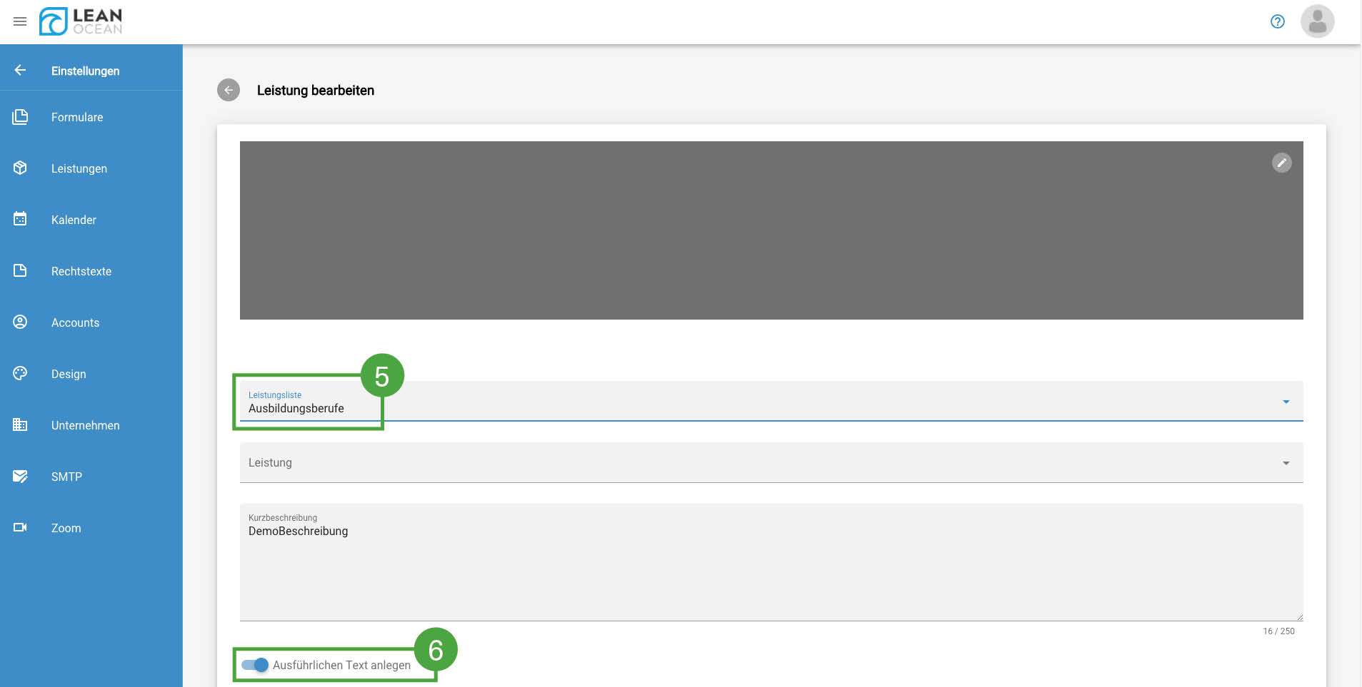 - Du solltest außerdem unbedingt zu jeder Leistung einen ausführlichen Beschreibungstext hinzufügen, damit die Besucher*innen, wenn sie deine Leistungen auswählen, sich ein genaueres Bild von der Tätigkeit machen können. Stelle dafür den Schalter “Ausführlichen Text anlegen” auf aktiv und gib den Text in das neu erscheinende Textfeld ein.