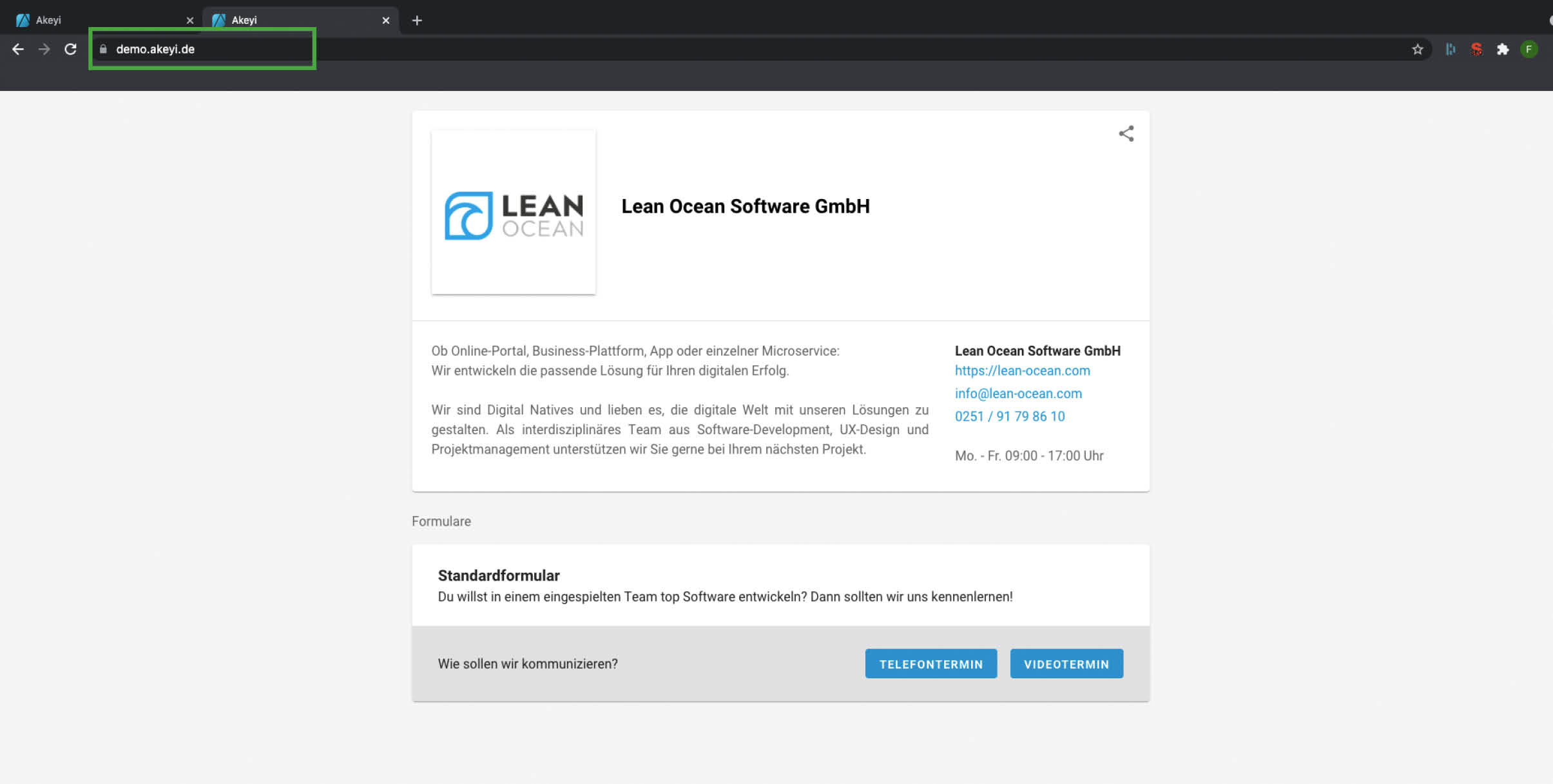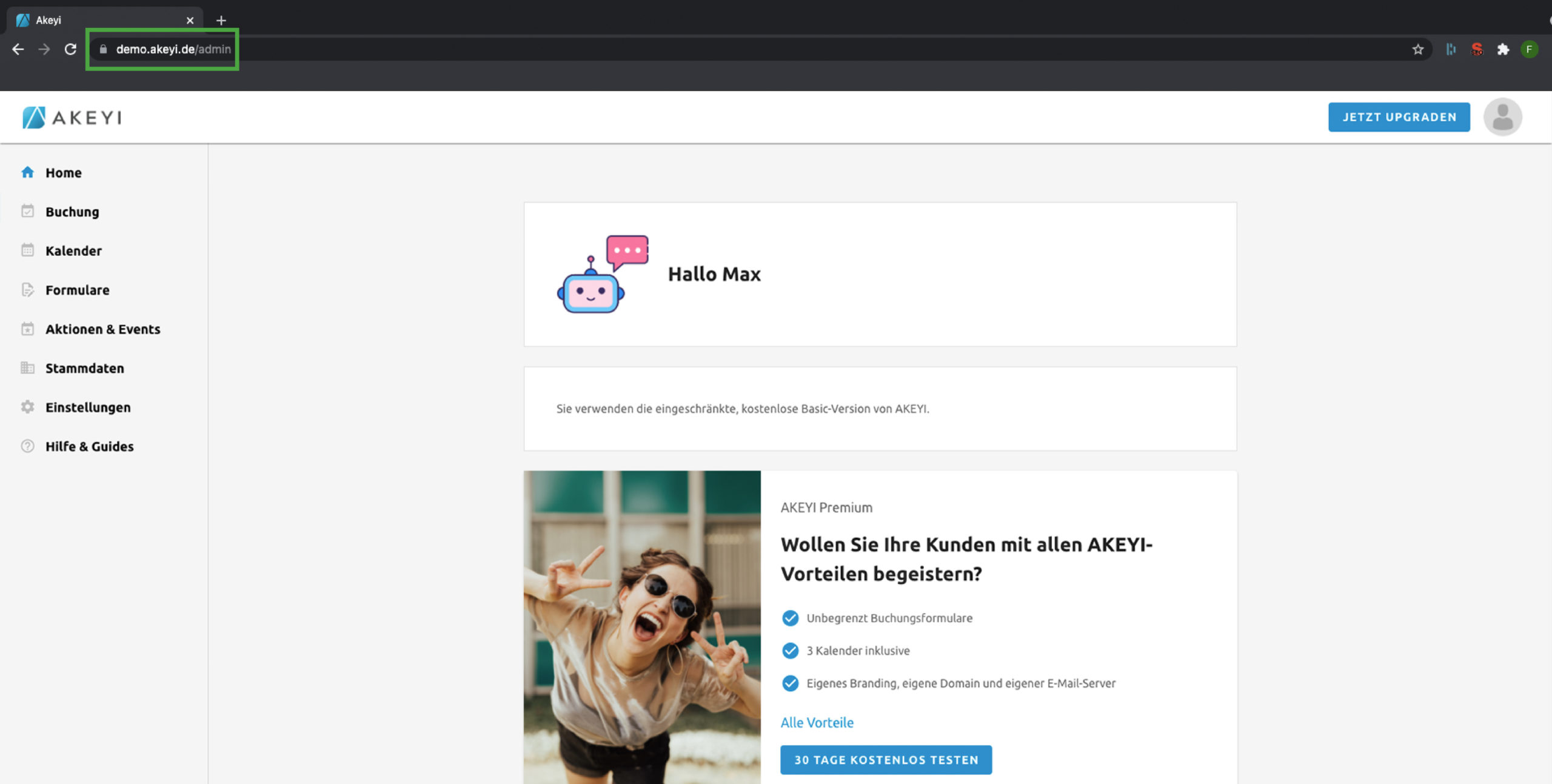 Ihre Akeyi-URL ist die Websiteadresse, unter der Sie sich anmelden und die Ihre Kunden nutzen können, um bei Ihnen Termine zu buchen. Unsere Demo-Seite hat beispielsweise die AKEYI-URL: demo.wp.akeyi.de.