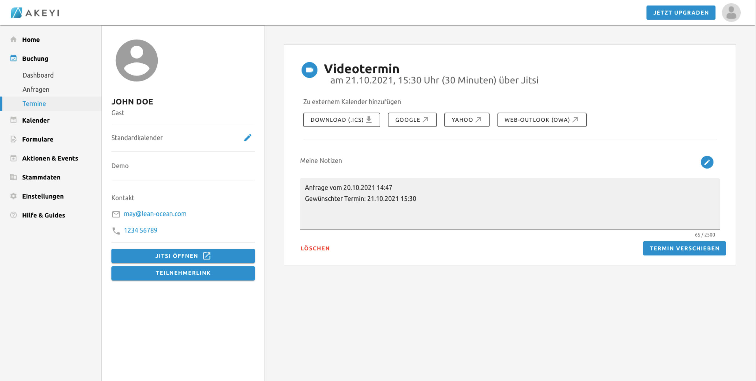 Sofern ein Videotermin mit Jitsi gebucht wurde, kannst du das Videogespräch hier direkt öffnen. Klicke dafür einfach auf „Jitsi öffnen“.