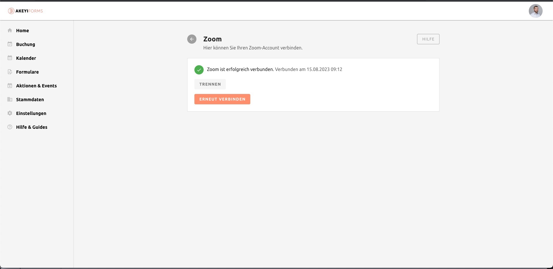 Wenn du deinen Zoom-Account mit AKEYI verbindest, werden zu deinen Terminen automatisch passende Zoom-Meetings erstellt und der Link per Mail mit deinem Gesprächspartner geteilt. Du kannst in AKEYI die Termine verschieben oder absagen und die Angaben werden automatisch in Zoom übernommen. So sparst du dir viel Vorbereitungsaufwand.