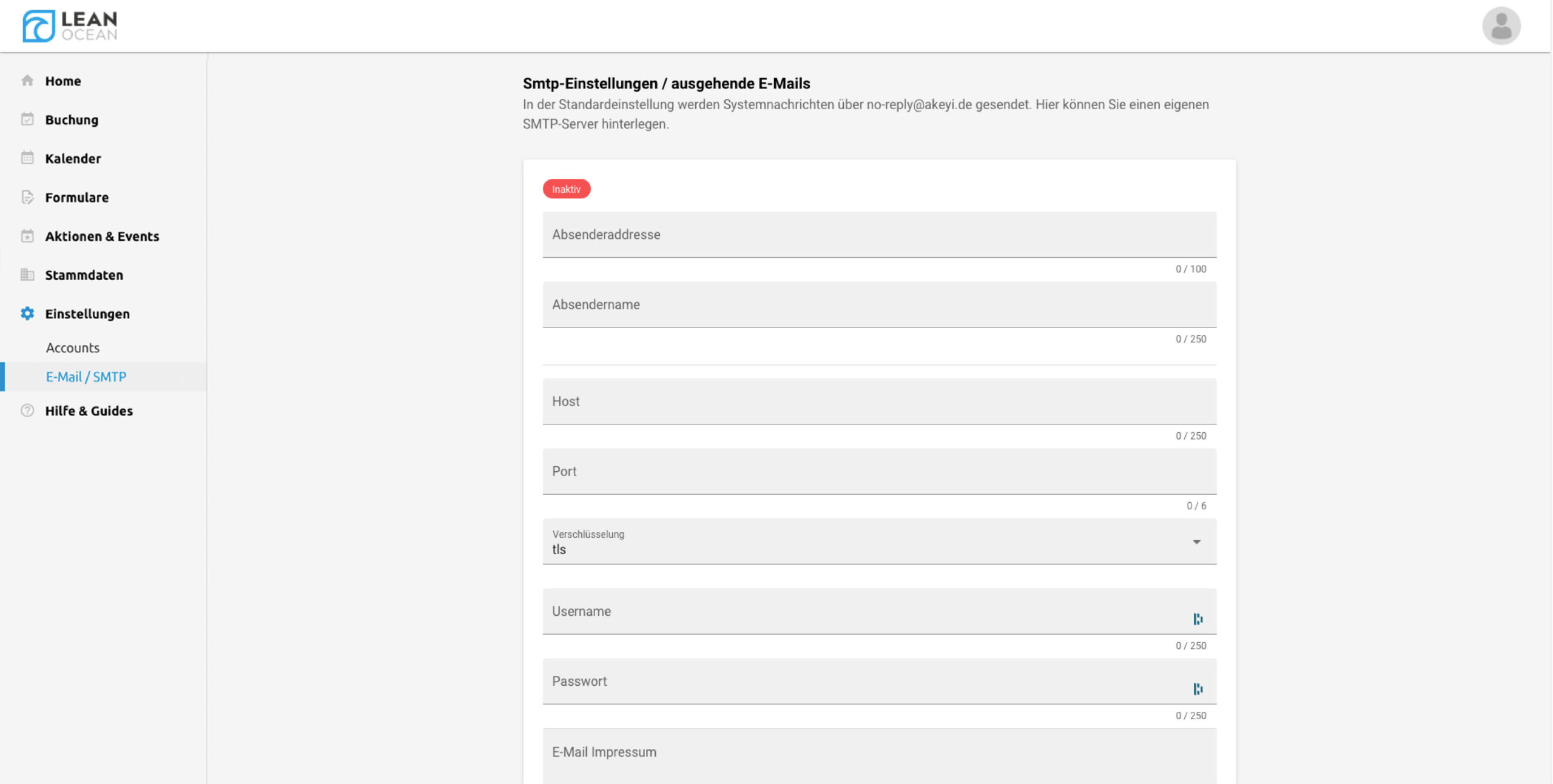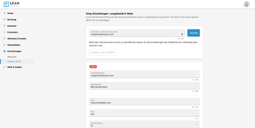 Damit die E-Mails an deine Kunden für die Terminbuchung von deiner E-Mail-Adresse aus versandt werden können, musst du in den Einstellungen die Daten des SMTP-Servers deines E-Mail-Anbieters eingeben.
