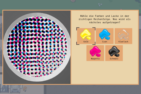 Welche Farben müssen in welcher Reihenfolge gedruckt werden, damit das Ergebnis überzeugt? In realitätsnahen Minigames stellen sich die Spieler*innen genau diesen Aufgaben – und lernen dabei spielerisch die zentralen Themen des Druckverfahrens kennen.