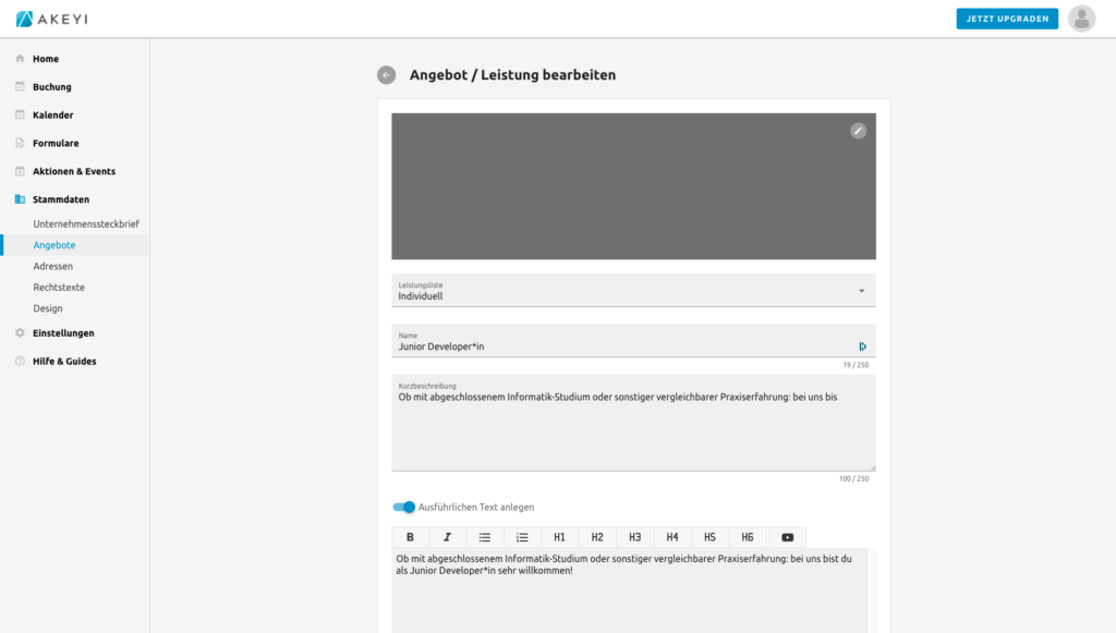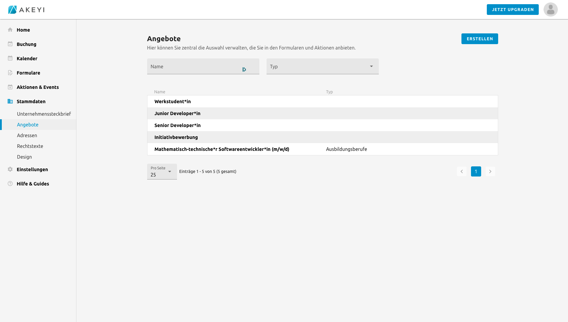 Tipp: In AKEYI kannst du deine Angebote (z.B. Stellenangebote) zentral über die Stammdaten erstellen und verwalten. So hast du den Vorteil, deine Angebote mit wenigen Klicks in unterschiedlichen Events und Formularen zu verwenden.